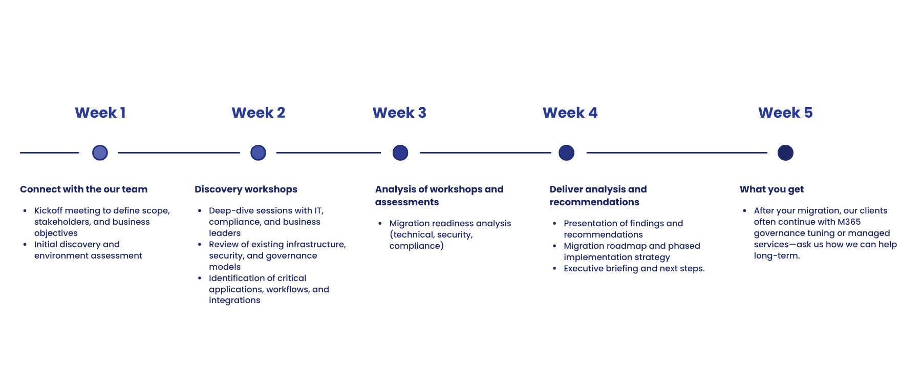 This structured, five-week engagement is designed to give you clarity, control, and confidence in your Microsoft 365 migration journey. It’s a $15,000 investment that pays off in risk reduction, operational alignment, and long-term success.
